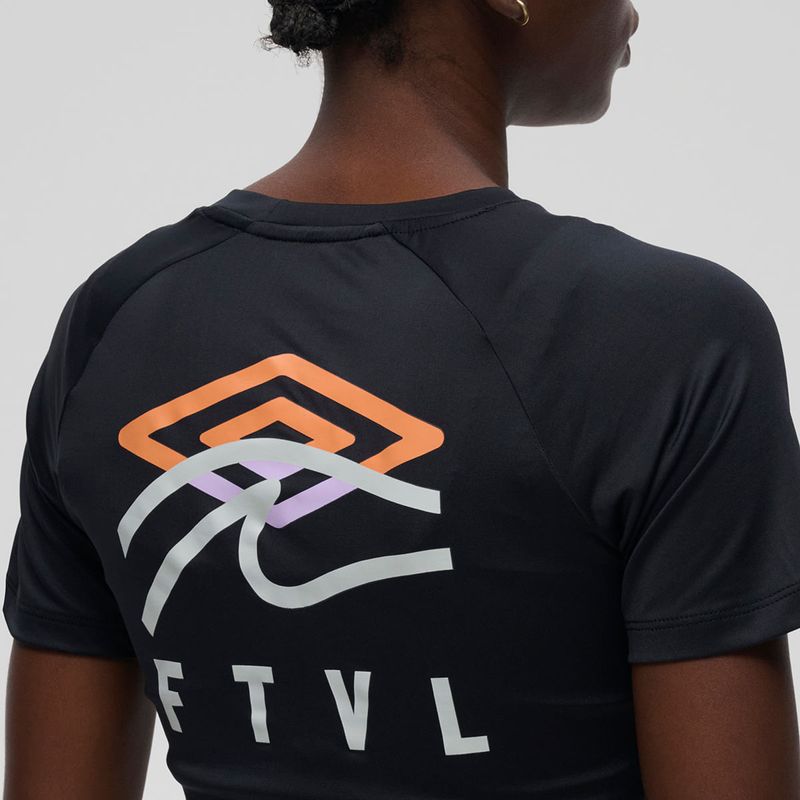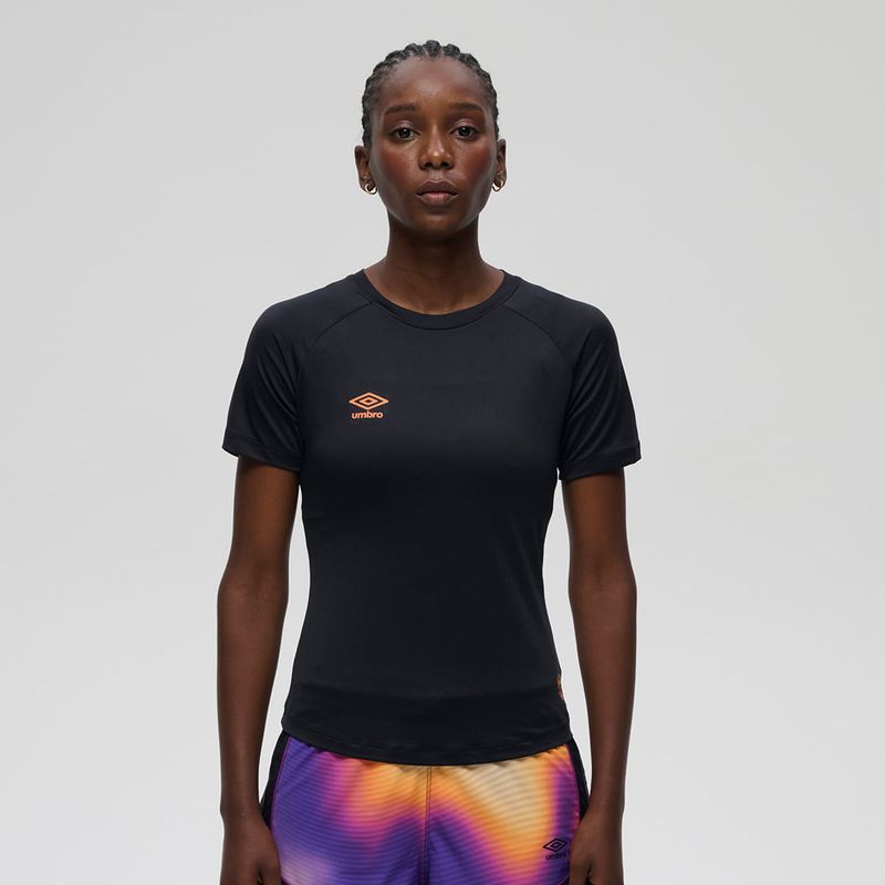 A Blusa de Futevôlei Feminina Flame é confeccionada em malha de poliéster elastizado, com proteção solar FPS 50+ dos raios UVA e UVB. Com modelagem regular, levemente acinturada, possui gola careca e manga curta raglan, além de barra arredondada para melhorar a mobilidade. Exibe logo Umbro Footvolley aplicado na parte frontal e arte gráfica estampada em silk nas costas.