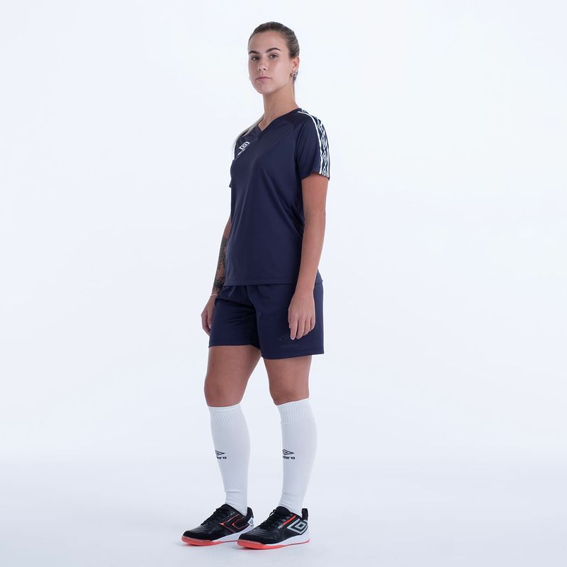 A camisa feminina Umbro Tradicional Tape é confeccionada em tecido 100% poliéster. Ela possui gola careca, manga ranglan e detalhe de fita com logo Umbro no ombro.
