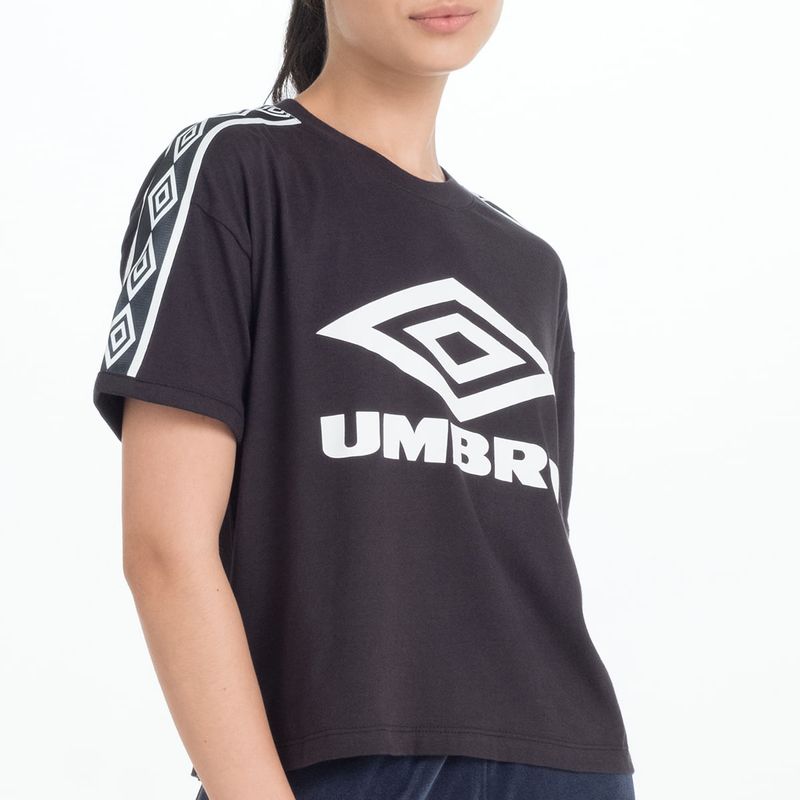 Camiseta feminina confeccionada em meia malha premium de algodão. Modelagem um pouco mais curta que a regular, com gola careca em ribana e manga curta. Possui tape Umbro personalizado aplicado no ombro e nas mangas, aberturas laterais na barra, cobre gola com tape personalizado e maxi logo Umbro em silk centralizado na parte frontal superior.
