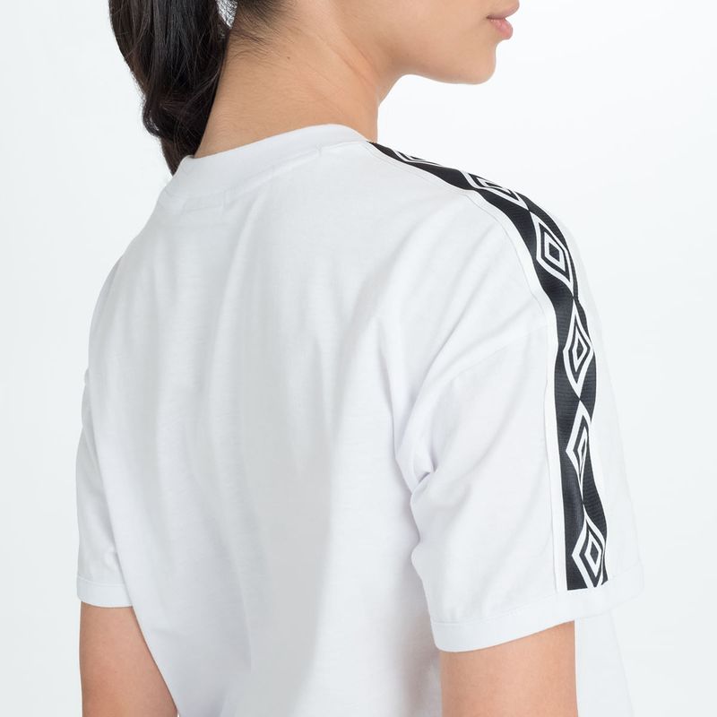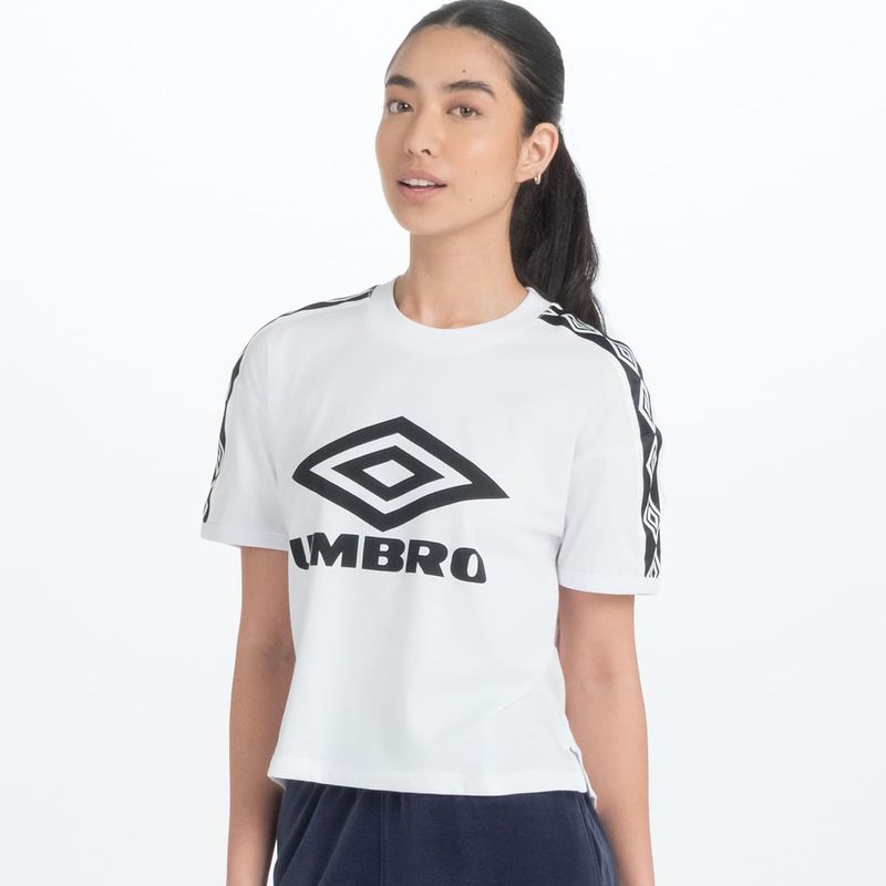 Camiseta feminina confeccionada em meia malha premium de algodão. Modelagem um pouco mais curta que a regular, com gola careca em ribana e manga curta. Possui tape Umbro personalizado aplicado no ombro e nas mangas, aberturas laterais na barra, cobre gola com tape personalizado e maxi logo Umbro em silk centralizado na parte frontal superior.
