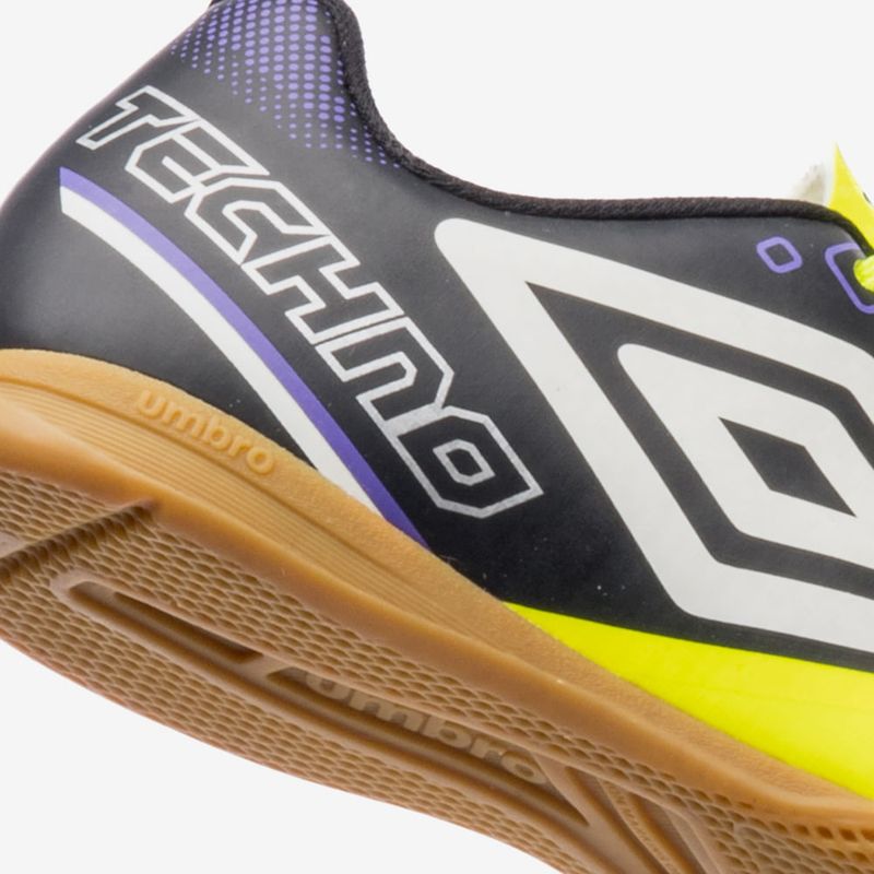 A Chuteira Futsal Umbro Techno II Jr foi desenvolvida para jogadores jovens que buscam um design moderno e ousado. O modelo destaca-se pelo efeito pixel em acabamentos fosco e brilhante, oferecendo um visual arrojado. O cabedal em material laminado com textura plana e contraste apresenta arte gráfica em serigrafia e cores contrastantes. Possui palmilha interna em EVA forrada e solado de futsal em borracha monocolor com tecnologia Hypergrip.