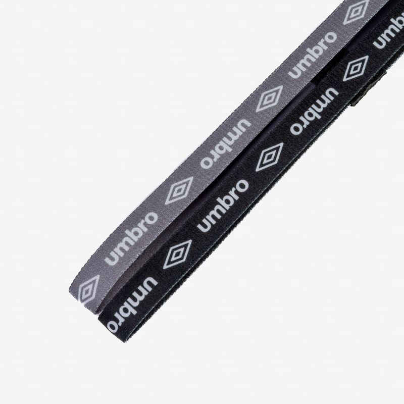 Kit com 2 faixas unissex confeccionadas em elástico fino de 1,3 cm, ideal para a prática de exercícios leves ou de alta performance. Possui aplicação de silicone na parte interna para evitar que a faixa deslize durante o uso e logotipia Umbro sublimada.